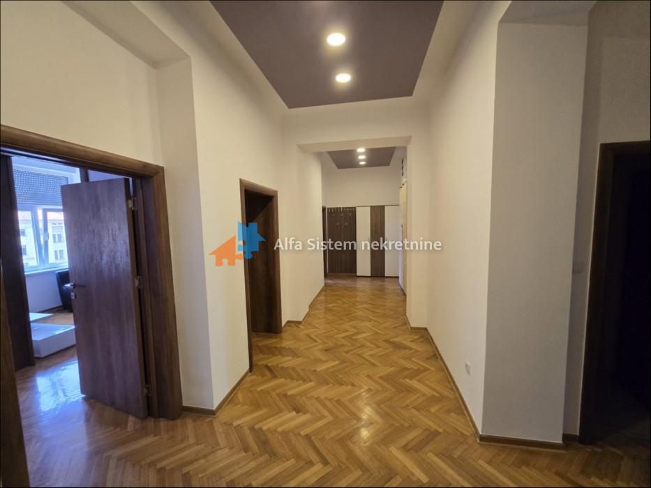 A bright and very spacious salon apartment of 100m² is available for rent in the very center of the city, located on the third floor of a well-maintained pre-war building. The building has a tidy courtyard, and the apartment is south-facing with a view of a green courtyard, providing a peaceful and pleasant atmosphere in the heart of the city.